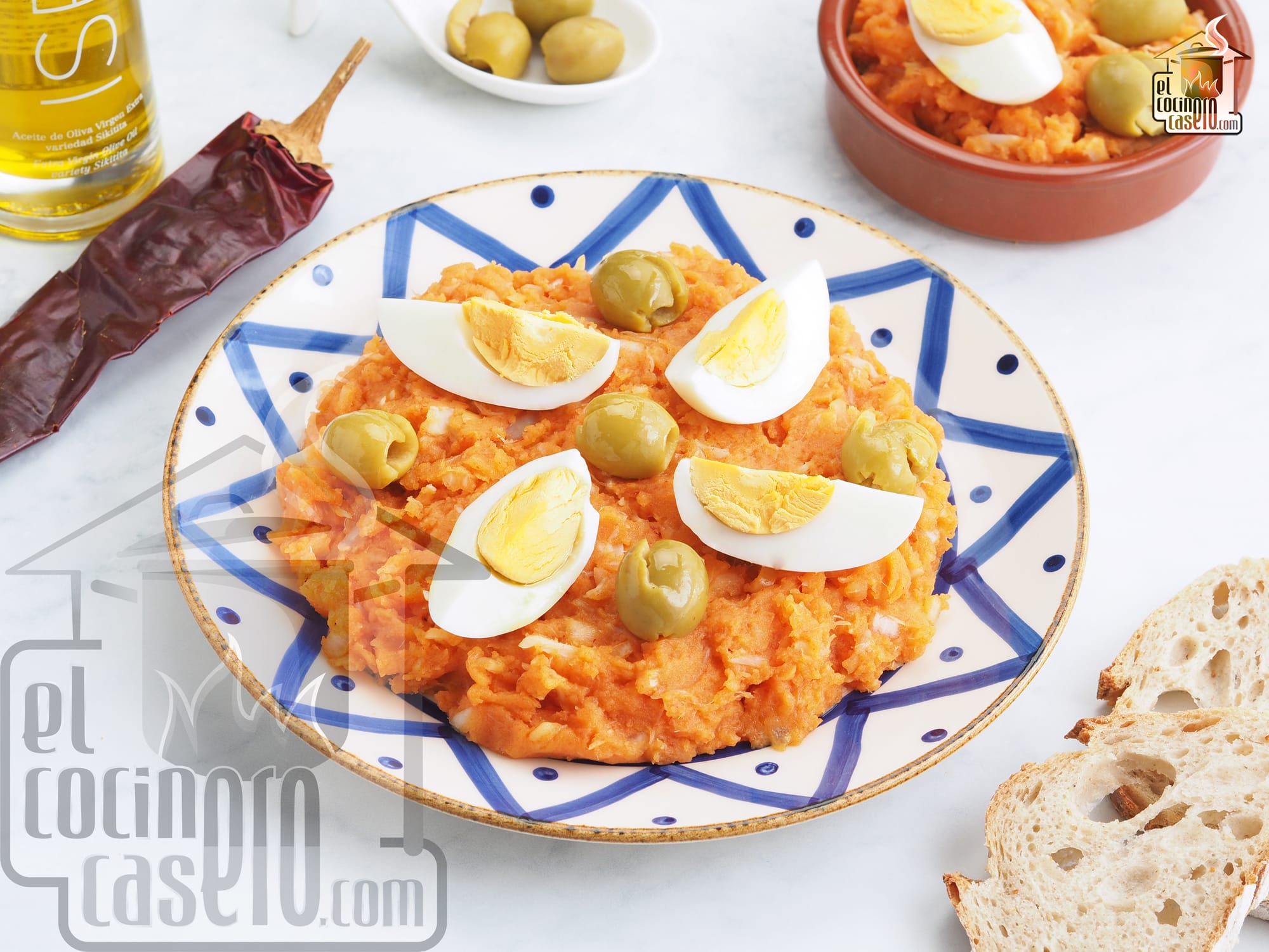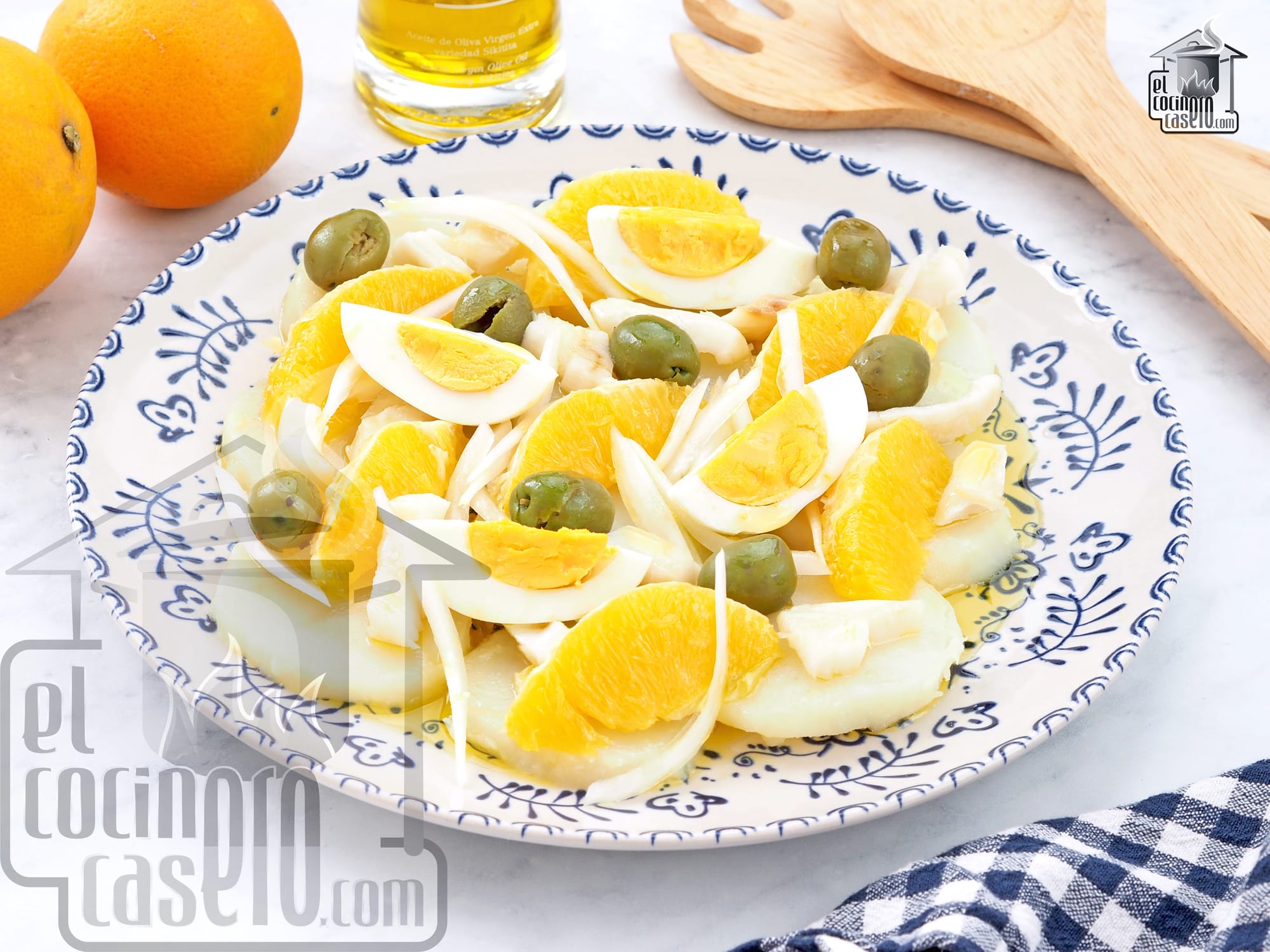 La ensalada malagueña es una receta que tiene como ingredientes principales patata cocida, naranja, bacalao desalado, cebolleta, aceitunas verdes partidas y aceite de oliva virgen extra. Algunas recetas incluyen también huevo cocido.