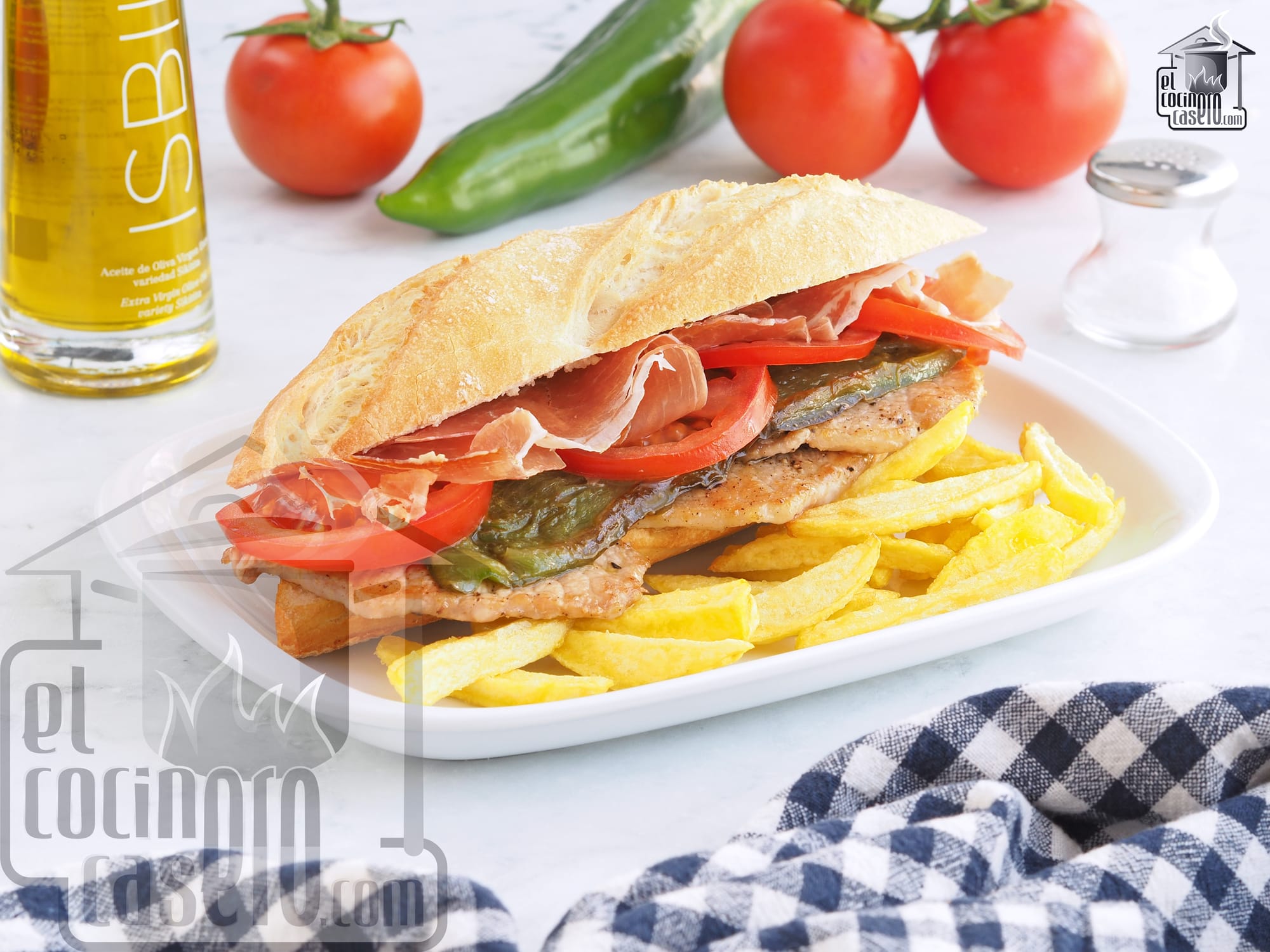 El serranito es un conocido bocadillo típico de Sevilla que lleva lomo de cerdo a la plancha acompañado de pimientos fritos, jamón serrano y tomate y que tradicionalmente se acompaña también con unas patatas fritas.