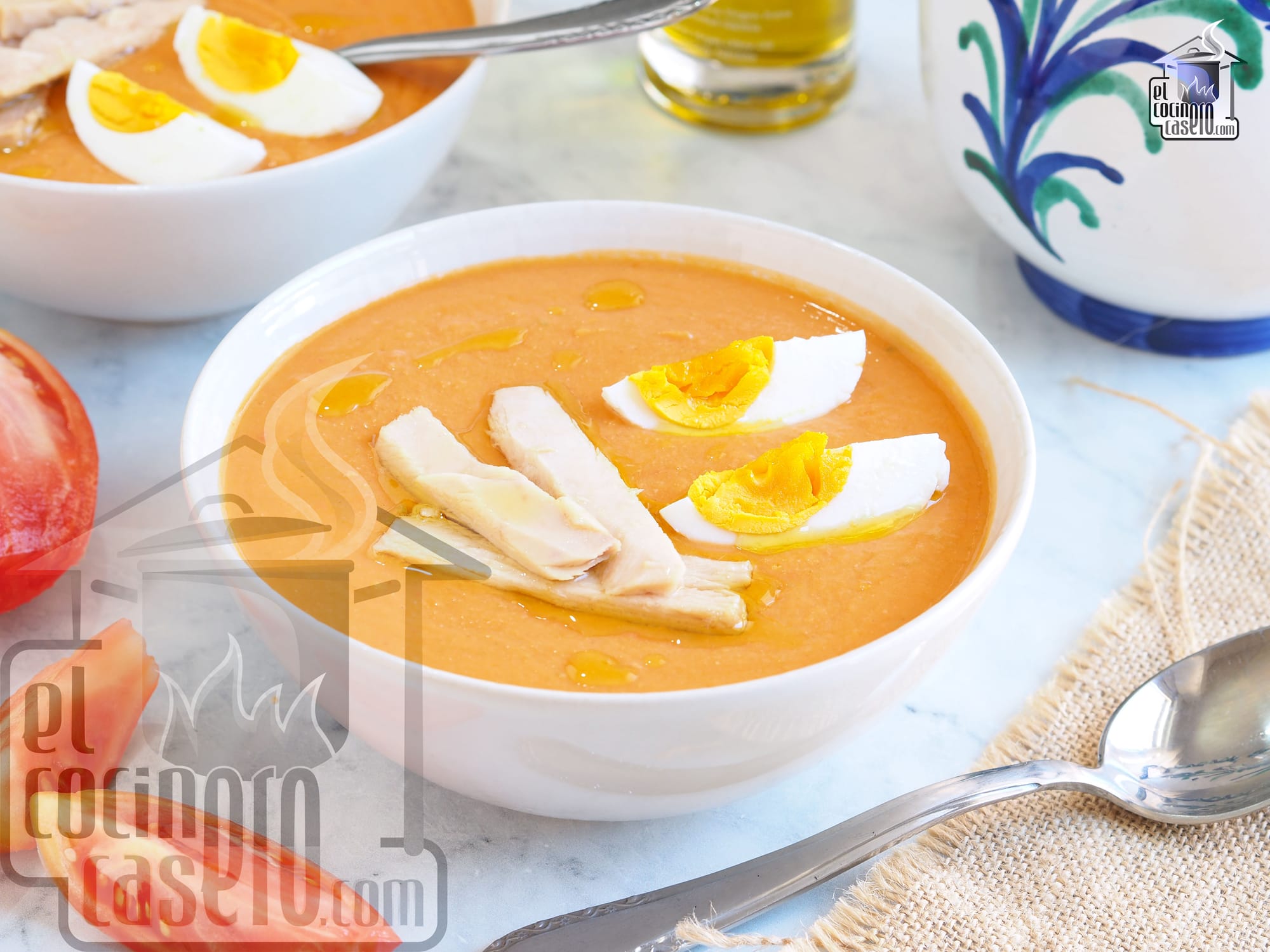 La porra antequerana es una sopa fría que se parece al salmorejo, aunque es más espesa porque lleva más cantidad de pan y que también puede recordar al gazpacho, puesto que lleva pimiento verde y vinagre. Lo más típico es servir la porra con huevo cocido y unos filetes de atún o melva en conserva.