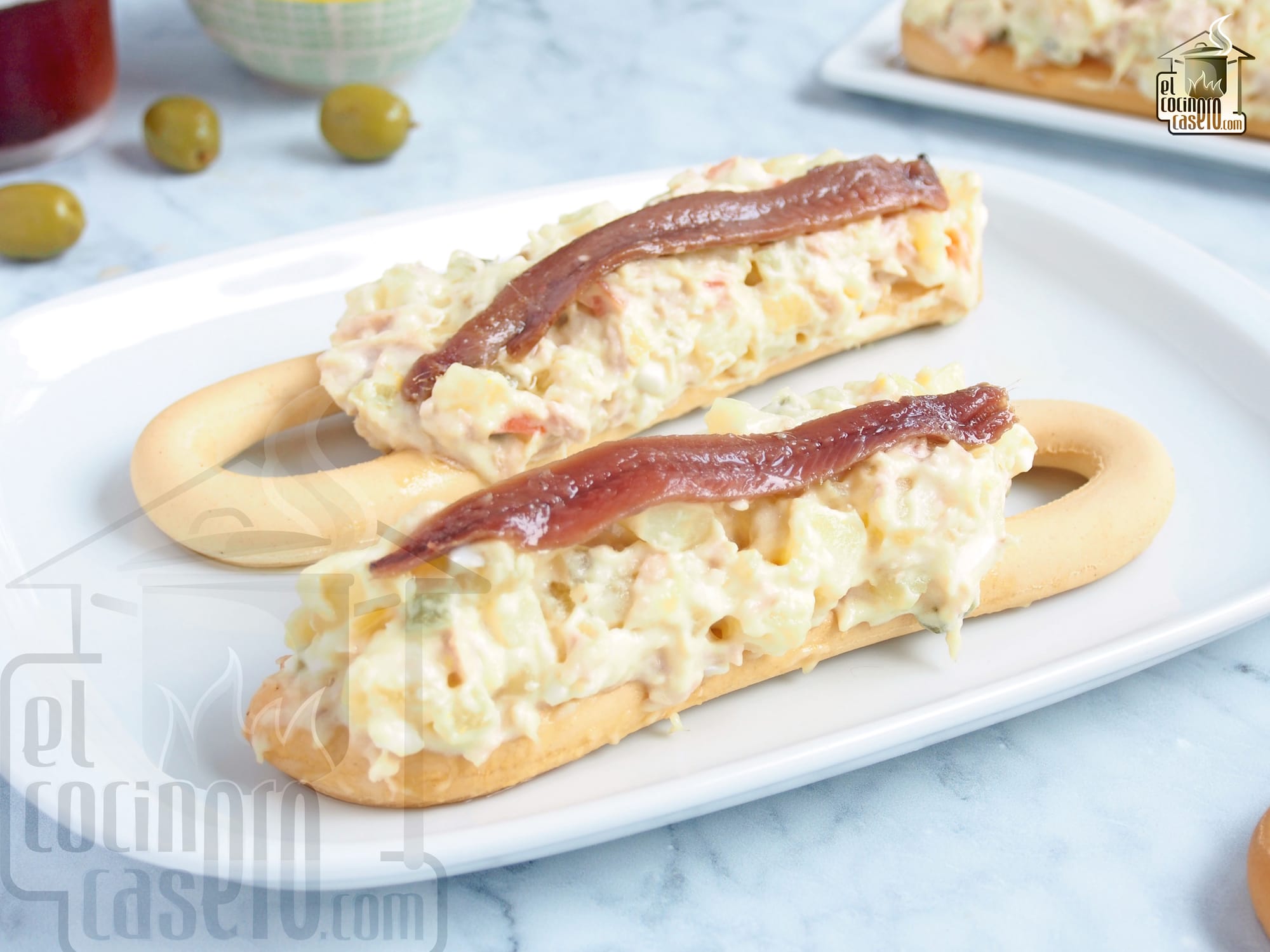 La marinera murciana es una de las tapas más típicas de Murcia que consiste en una rosquilla de pan alargada a la que se le pone encima ensaladilla murciana y se termina colocando encima una anchoa.