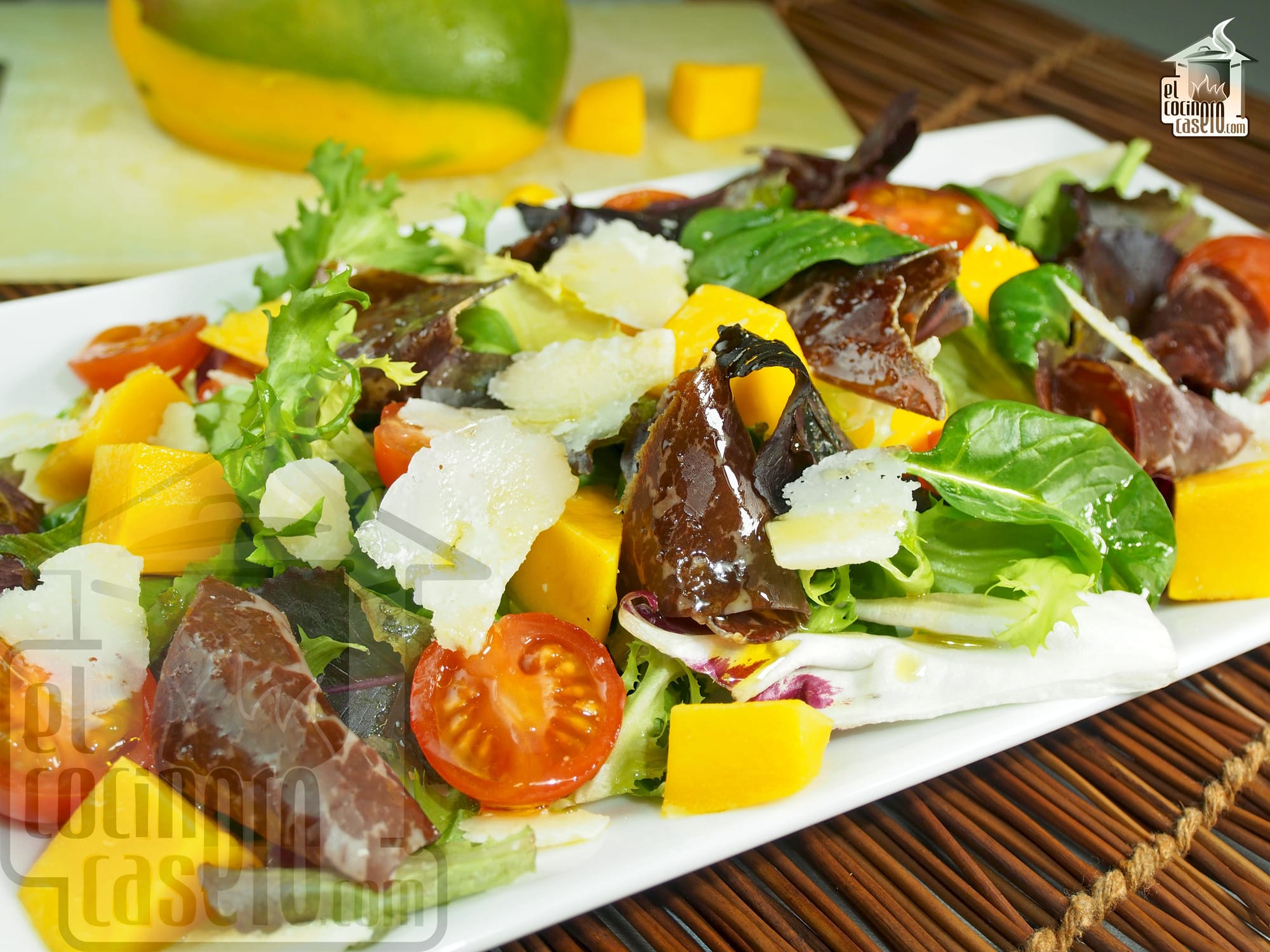 Esta ensalada de mango y cecina con Parmesano es de mis ensaladas favoritas. La combinación de ingredientes es súper original y está realmente rica.