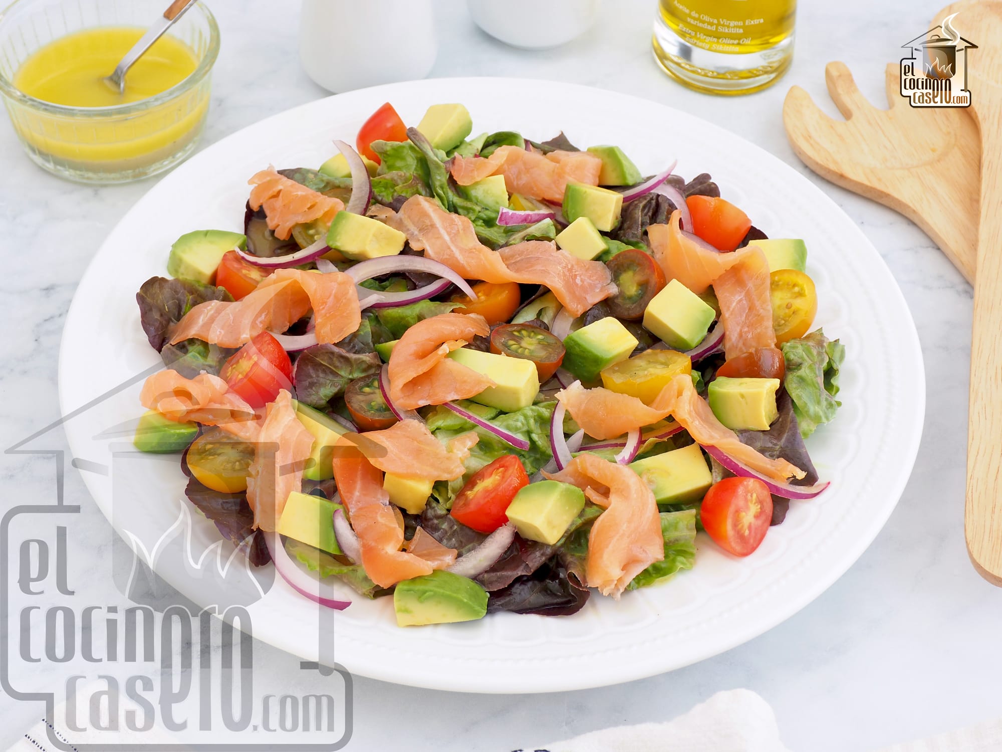 Esta ensalada de aguacate y salmón es una opción más clásica pero es un acierto seguro. Usando un salmón ahumado de calidad y un aguacate cremoso en su punto óptimo de maduración, tendremos una ensalada buenísima y muy vistosa.