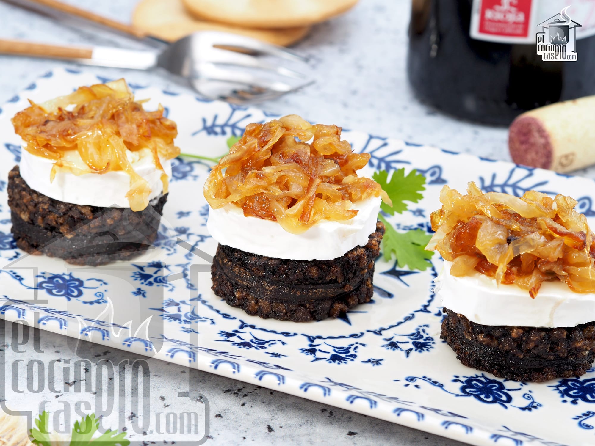 Este pincho tan rico se prepara con rodajas de morcilla de Burgos frita a las que se le pone encima un medallón de rulo de cabra y un poquito de cebolla carameliza. La mezcla de sabores y texturas es buenísima.