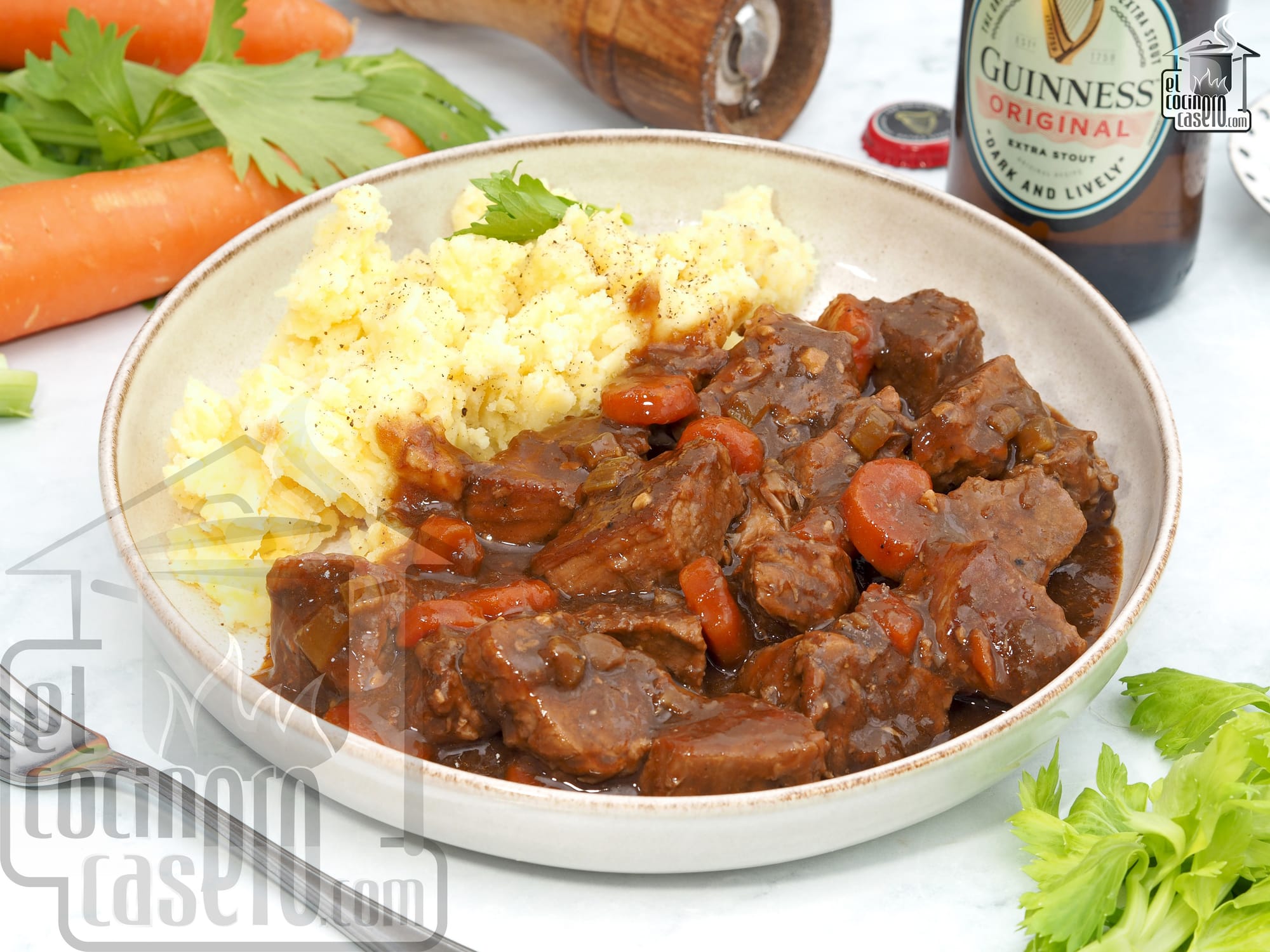 Esta receta es sin duda para los amantes de la cerveza Guinness, ya que preparamos un estofado clásico de ternera aderezado con esta cerveza negra que le da un toque de sabor y aroma muy especial.