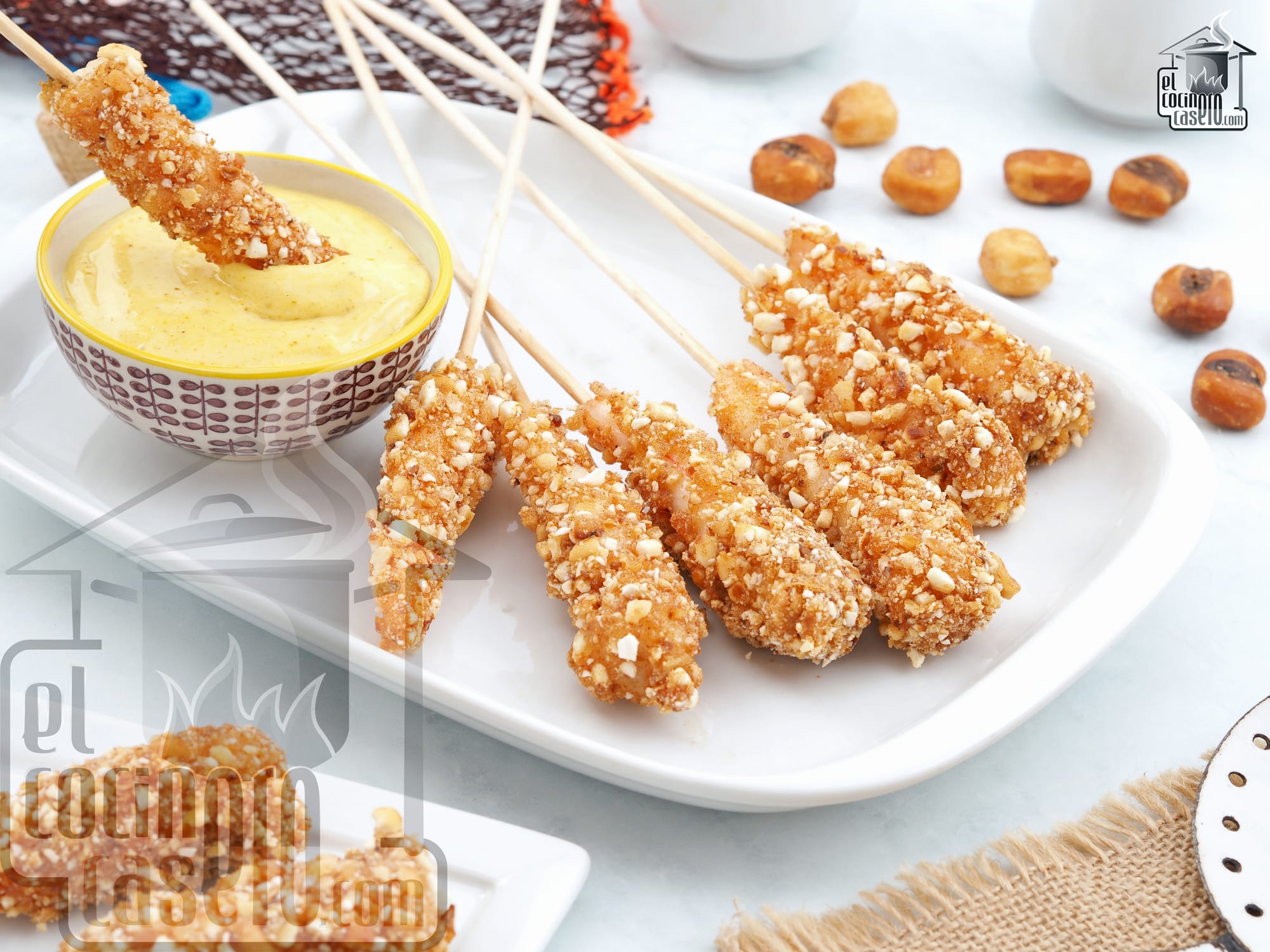 En esta receta preparamos unos langostinos crujientes rebozados con kikos y acompañados de una mayonesa de curry, un aperitivo fácil y muy vistoso que hará las delicias de nuestros invitados.