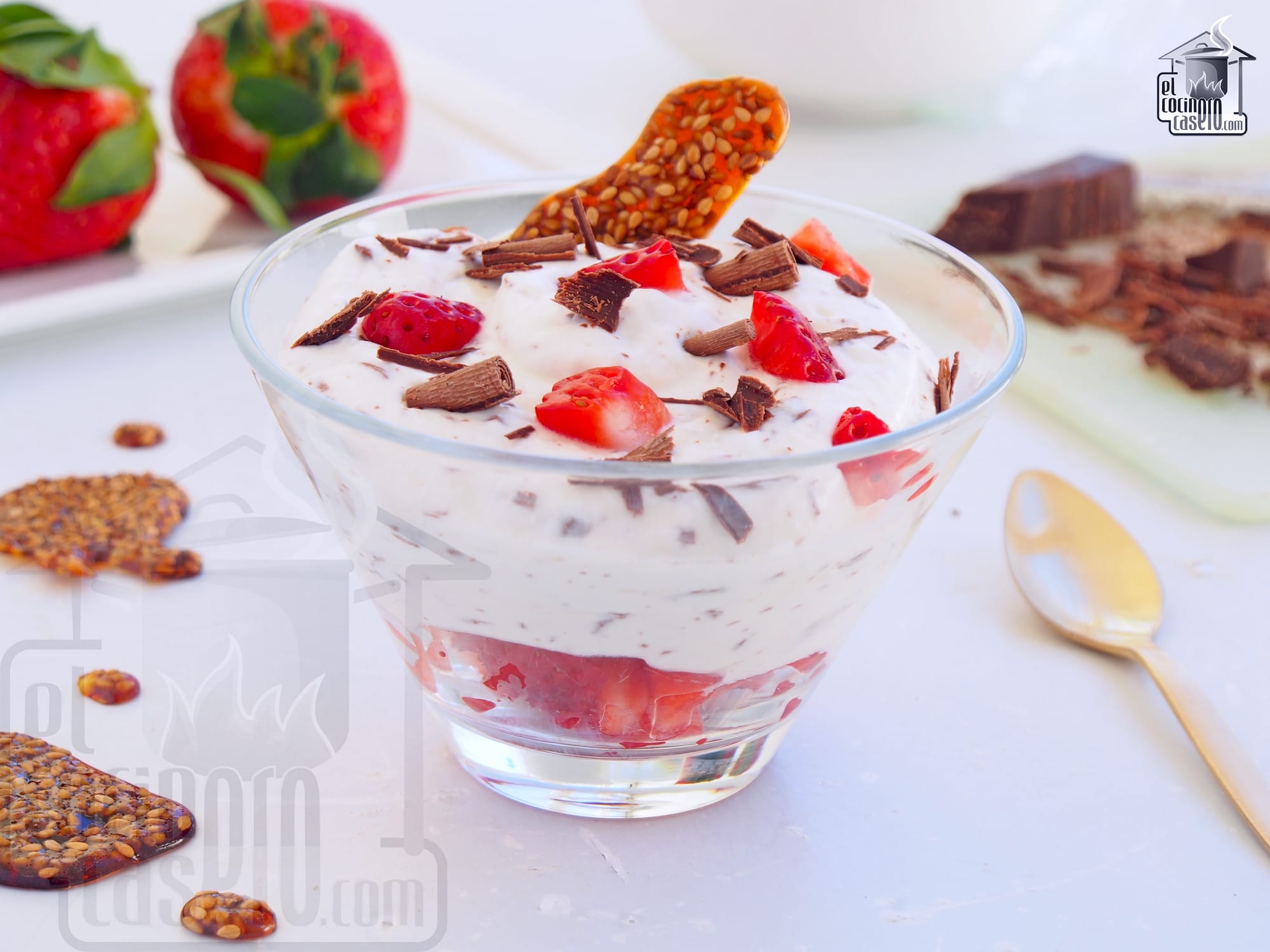 - Mousse de requesón con fresas. Una mousse diferente y original en la que incorporamos fresas y virutas de chocolate para darle un toque de color y sabor que le va de maravilla al requesón. Además preparamos un caramelo crujiente de sésamo para decorar la mousse y darle un toque crunchy que le queda fenomenal.
