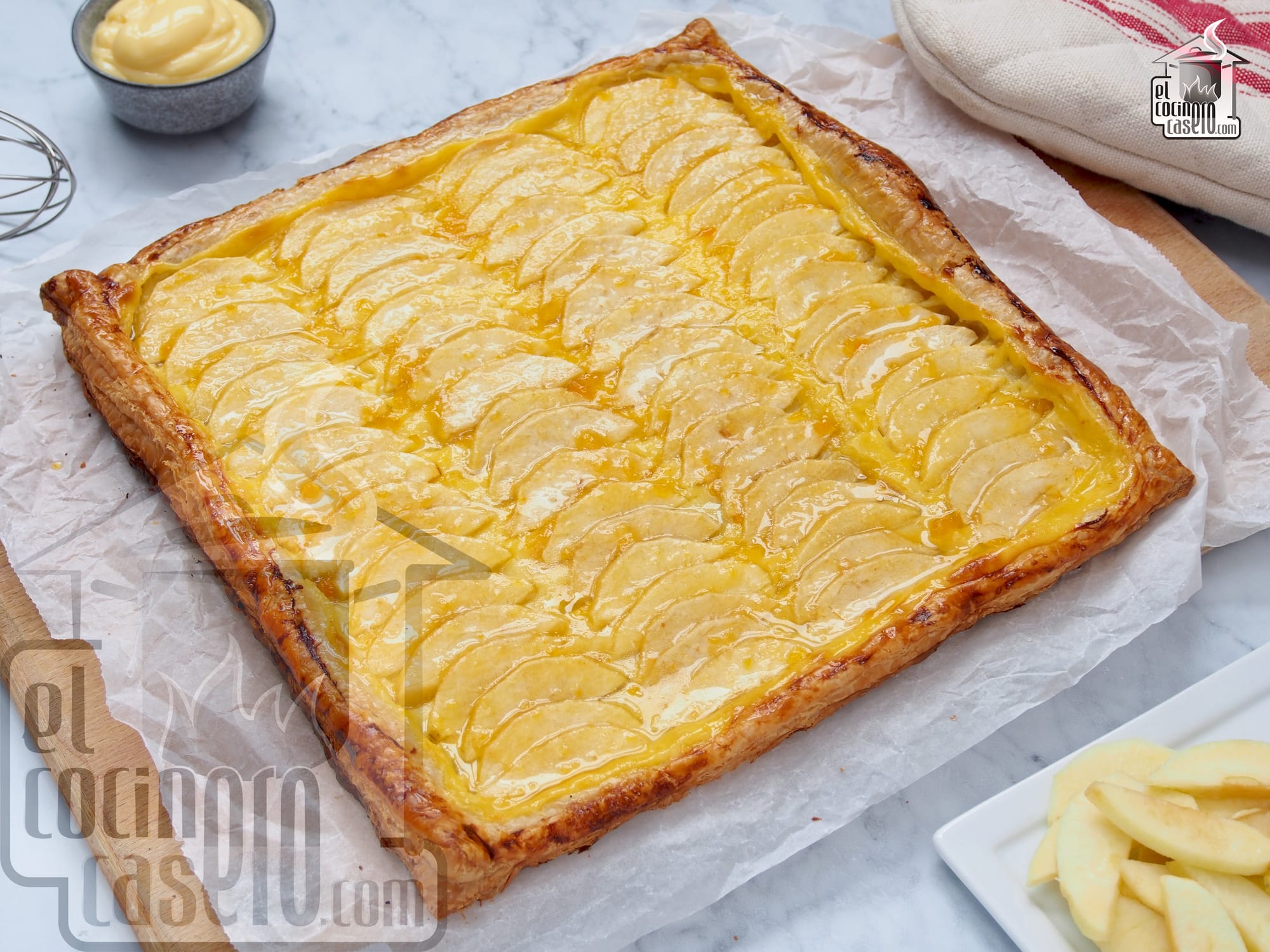 - Hojaldre de manzana. Las manzanas son un básico que podemos encontrar siempre en la frutería y normalmente a un precio más que aceptable. Una de mis recetas favoritas con esta fruta es esta clásica tarta de hojaldre con manzana y crema pastelera, un postre fácil que suele gustar a todo el mundo.