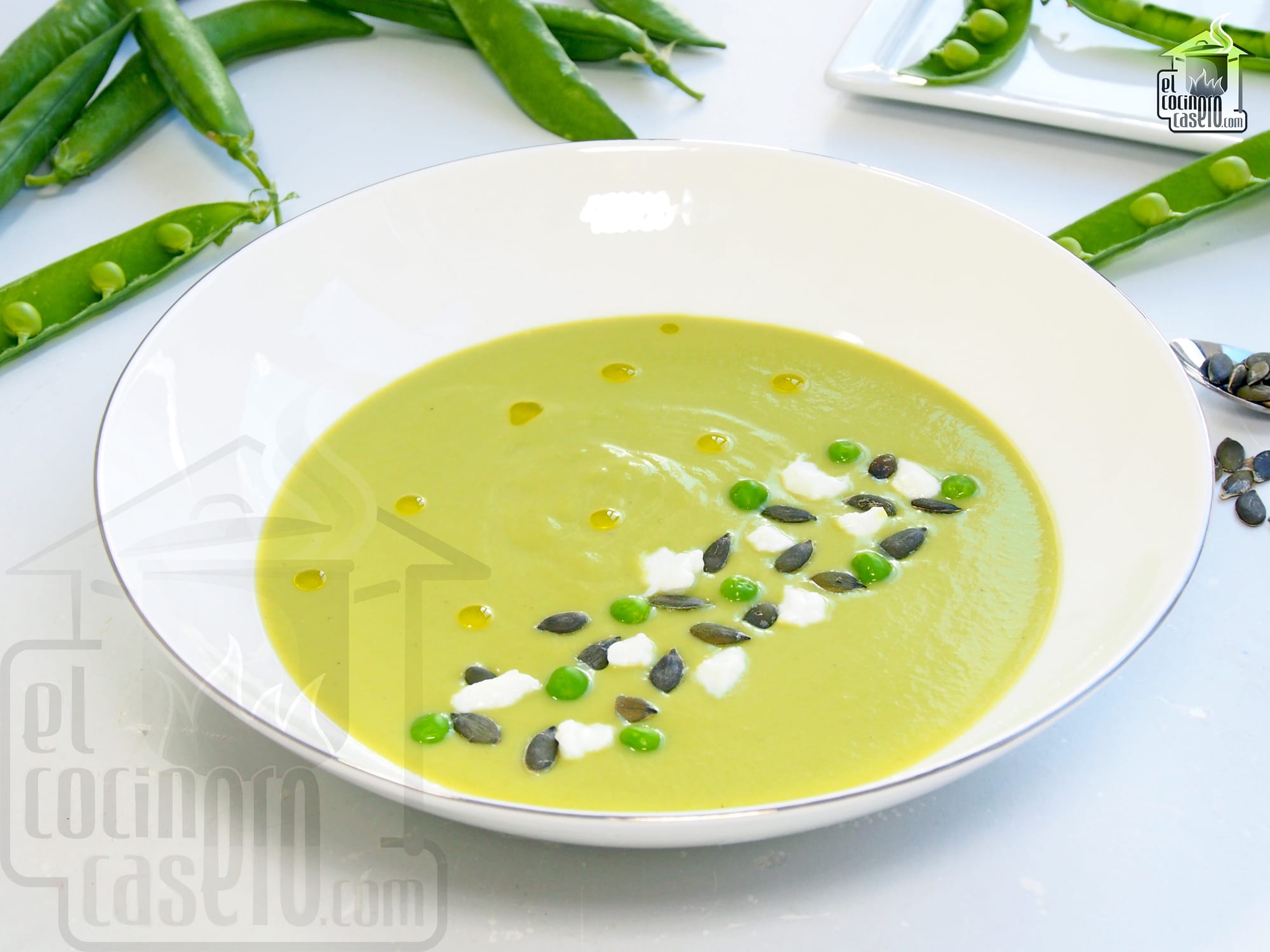 - Cena: para la cena del domingo podemos preparar algo más ligero como esta crema de guisantes aprovechando que los guisantes frescos están en plena temporada. Acompañamos la crema con unos daditos de queso de O Cebreiro y unas pipas de calabaza.