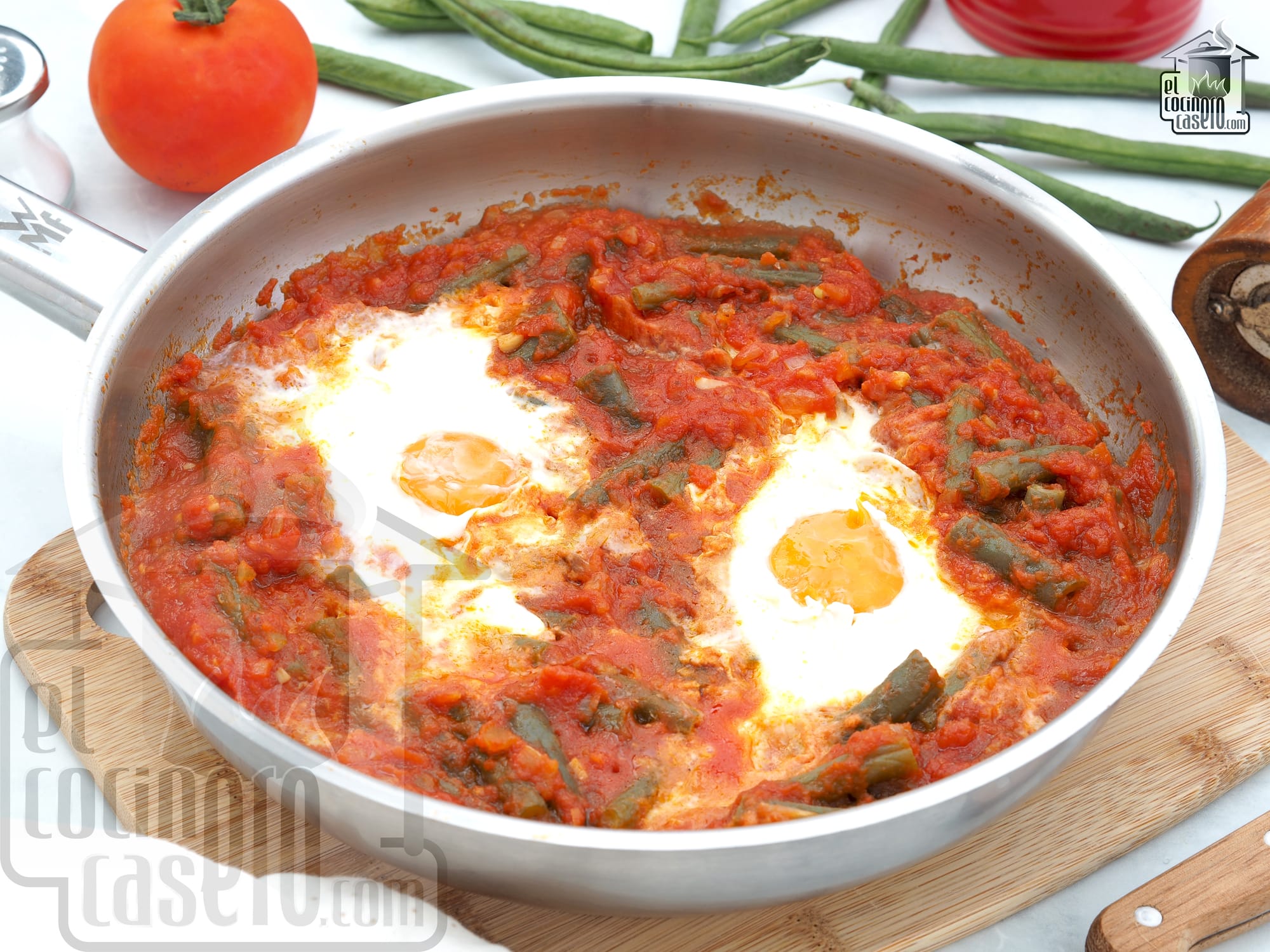 - Cena: para la cena podemos preparar estas judías verdes con tomate a las que además añadimos unos huevos que cocinamos en la propia salsa de tomate.