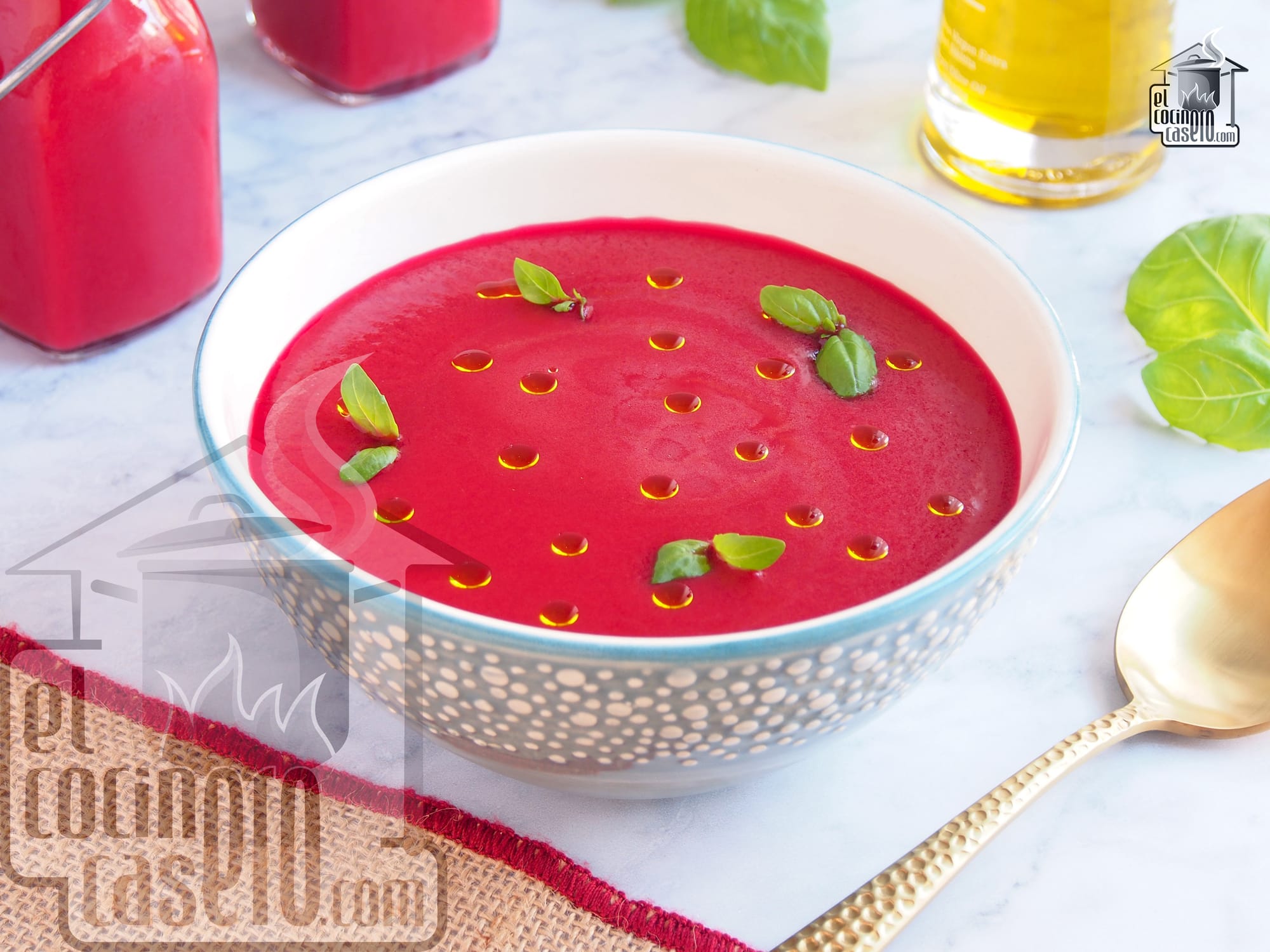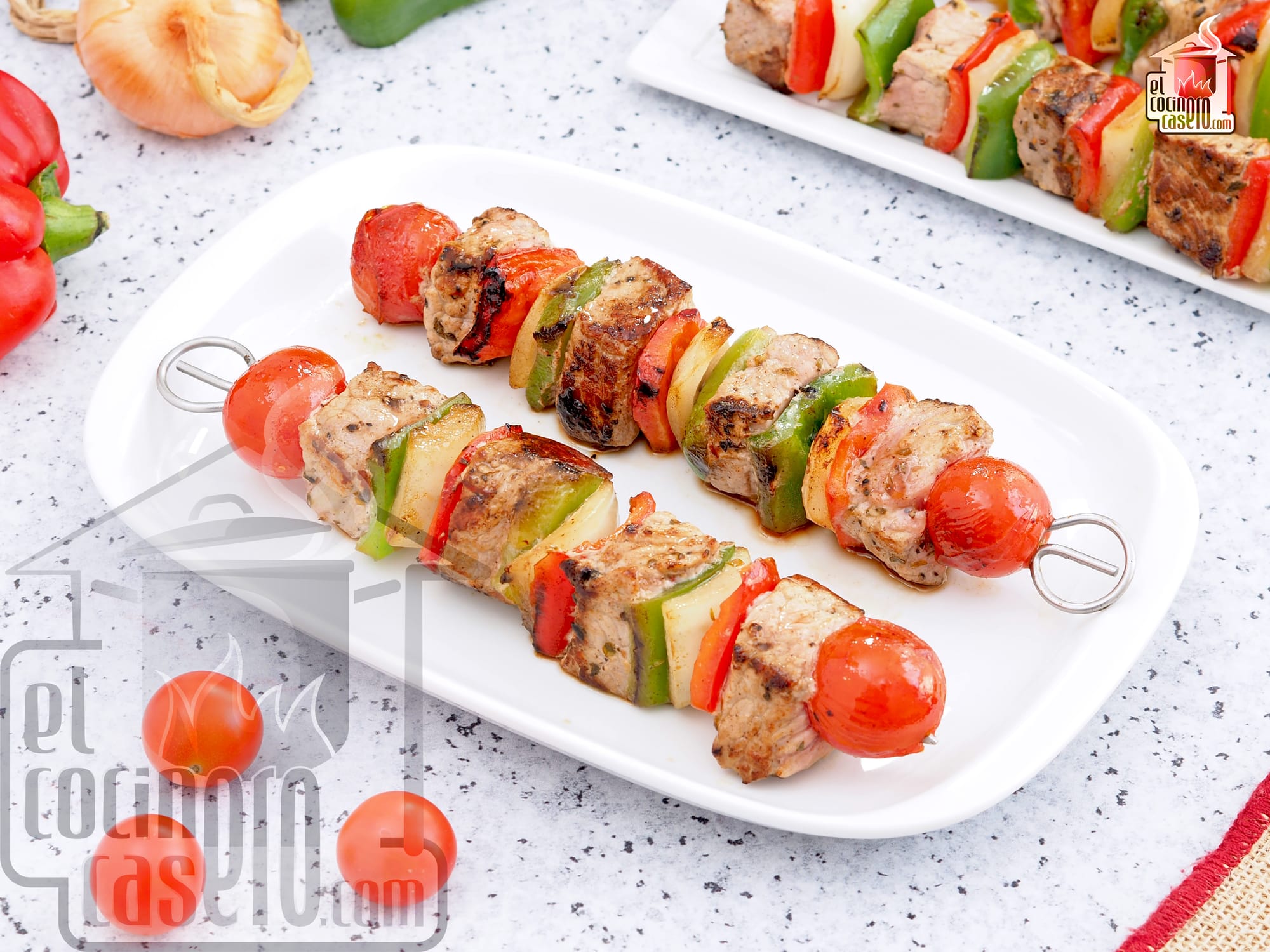 - Comida: para el entrante podemos preparar este gazpacho de remolacha que se puede hacer con remolacha de la que ya se vende cocida y lista para usar o con remolacha cruda que tendríamos que cocer nosotros en casa. De plato principal, preparamos unas brochetas de ternera que quedan súper tiernas y jugosas y que acompañamos de cebolla, pimiento rojo y verde y tomatitos cherry.