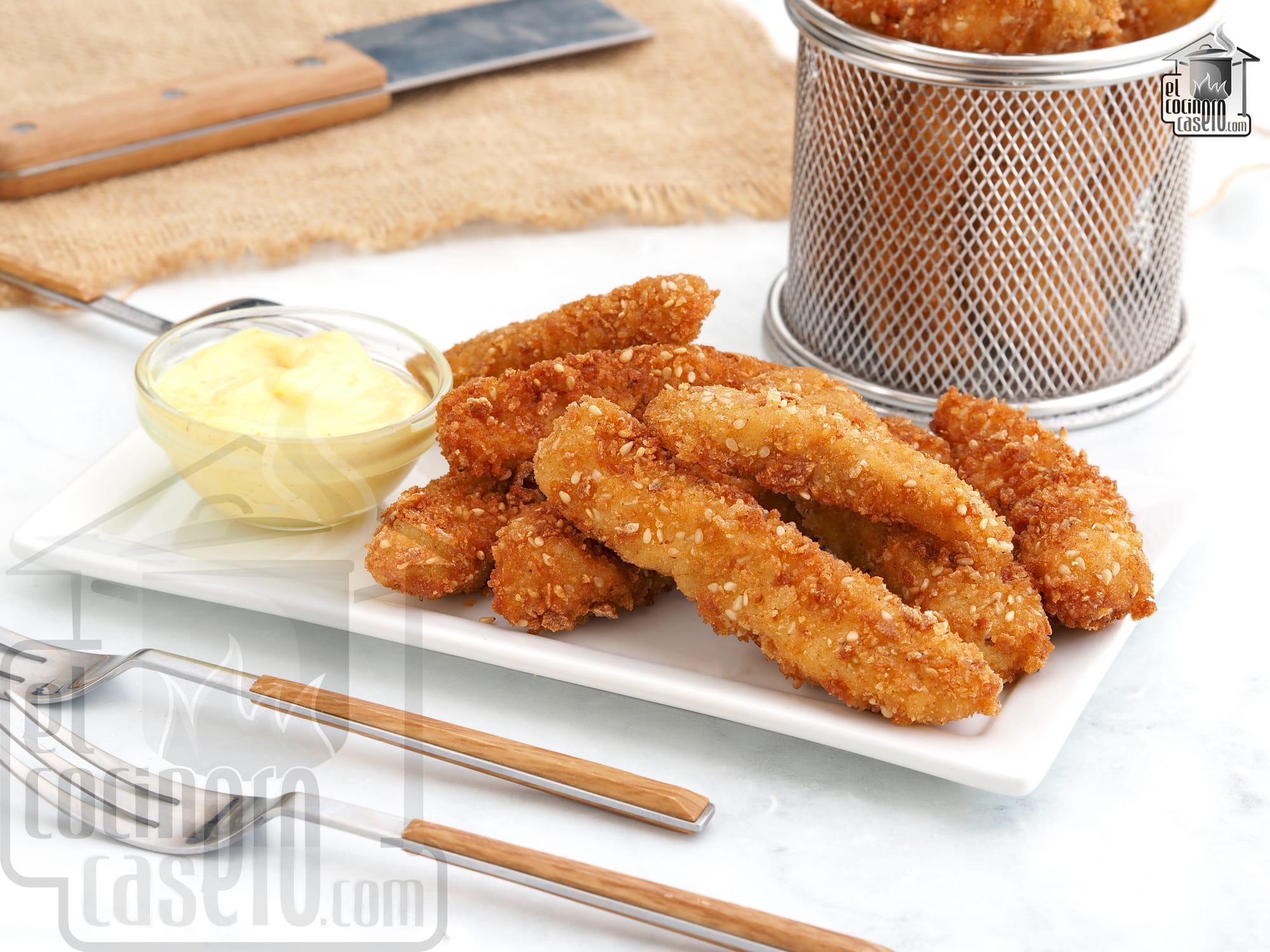 - Cena: para la cena del sábado te propongo estos fingers de pollo marinado con mayonesa de curry que están para chuparse los dedos.
