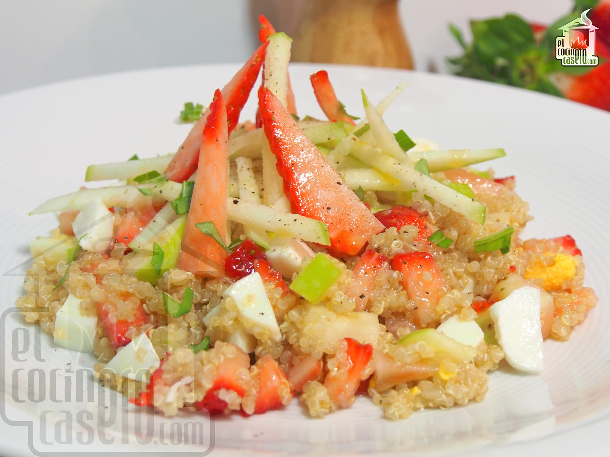 - Cena: para la cena te propongo estas ensalada de quinoa con fresas que también lleva manzana y mozzarella, una combinación de sabores distinta y original que hacen que esta ensalada sea muy apetecible.