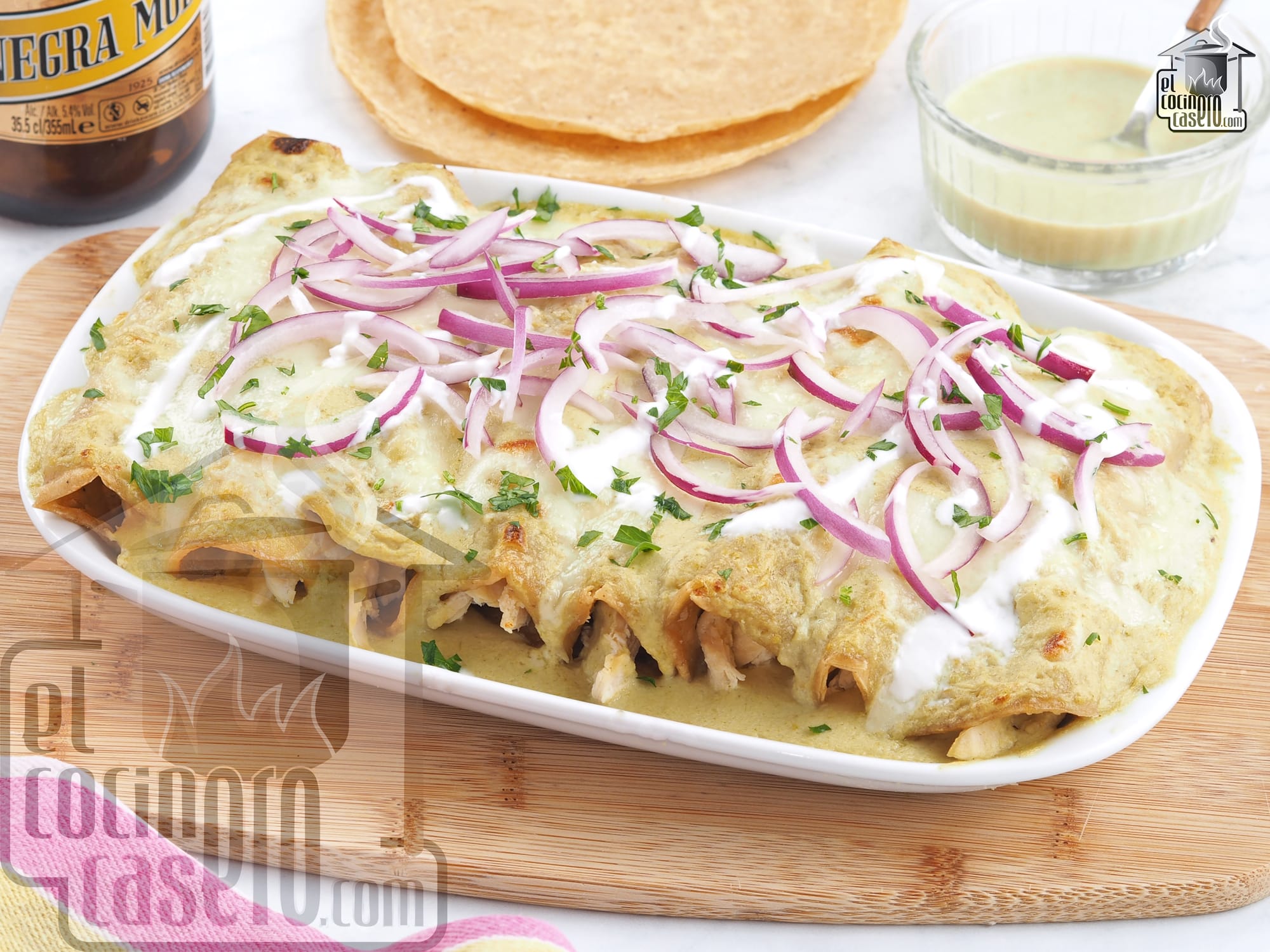 - Cena: para la cena del viernes noche, podemos preparar un plato algo más festivo como estas enchiladas suizas, un famoso plato mexicano que consiste en tortillas de maíz rellenas de pollo cocido que se enrollan formando un canutillo y se bañan con una salsa verde para terminar gratinándose con queso en el horno.