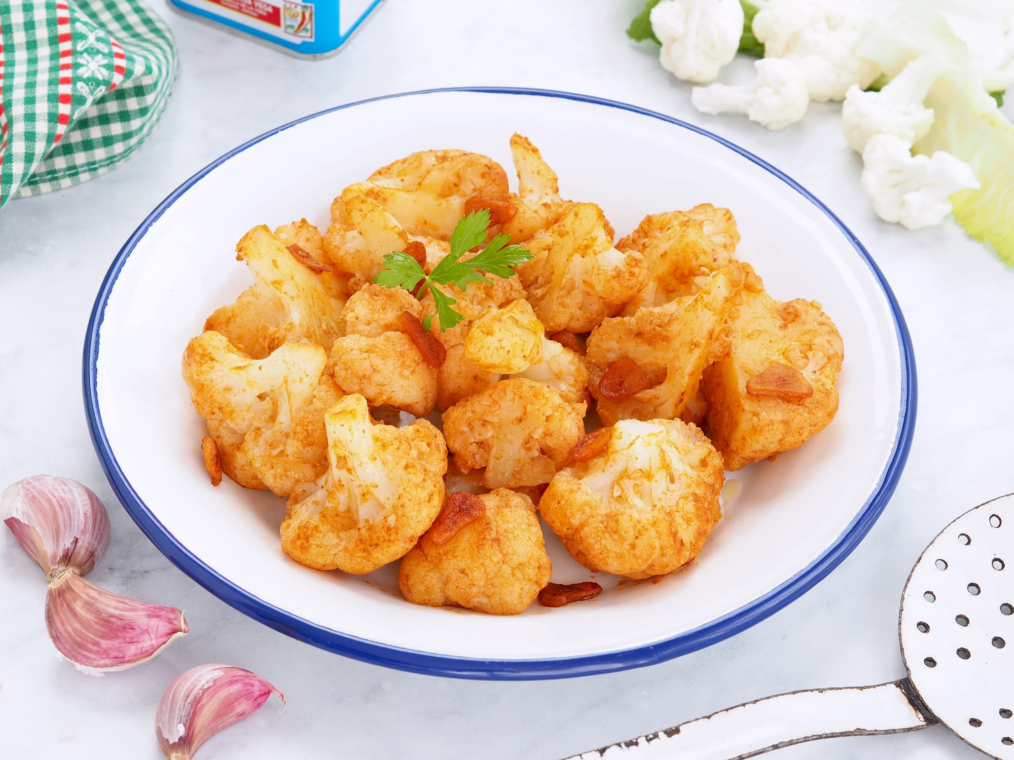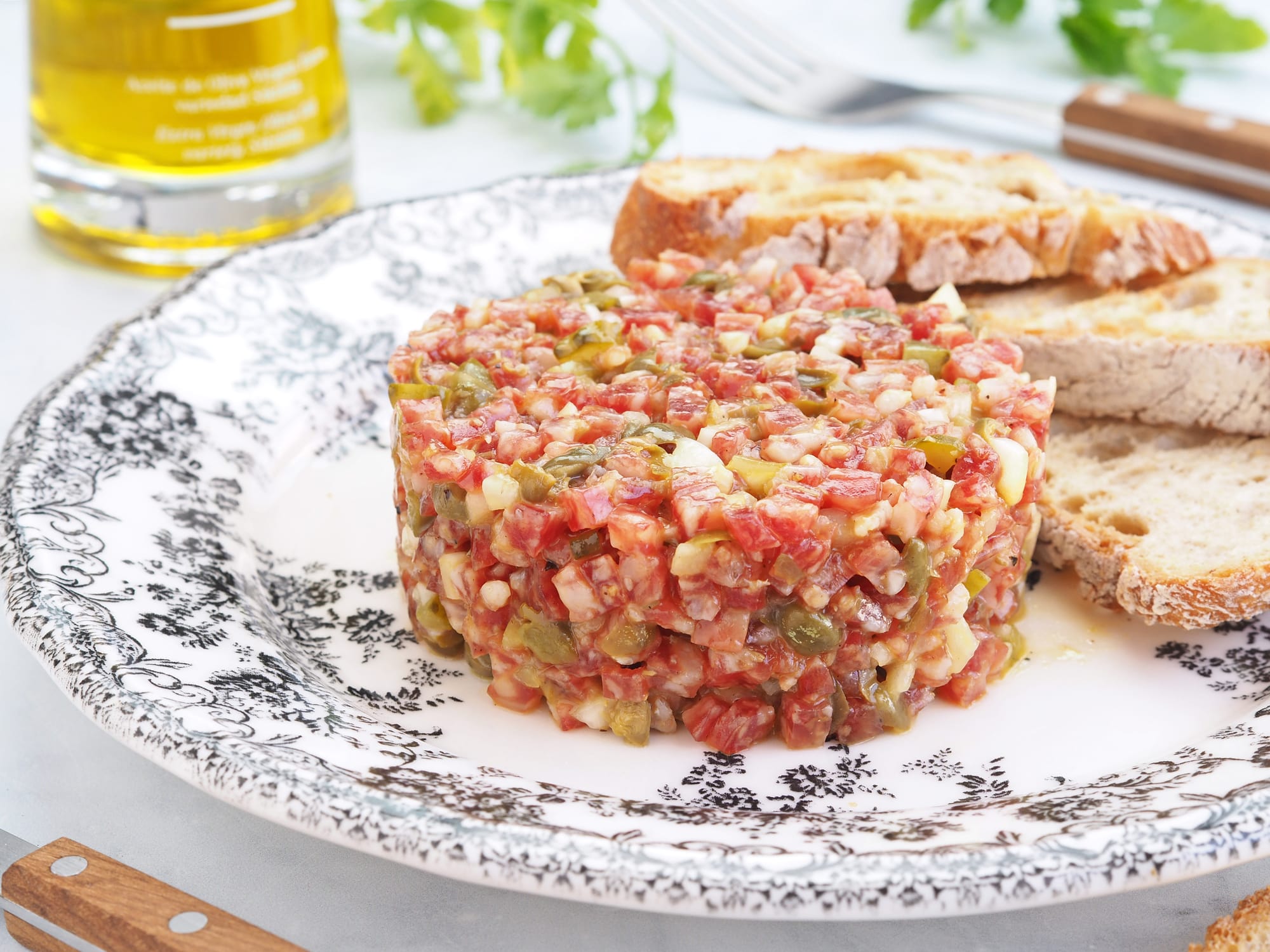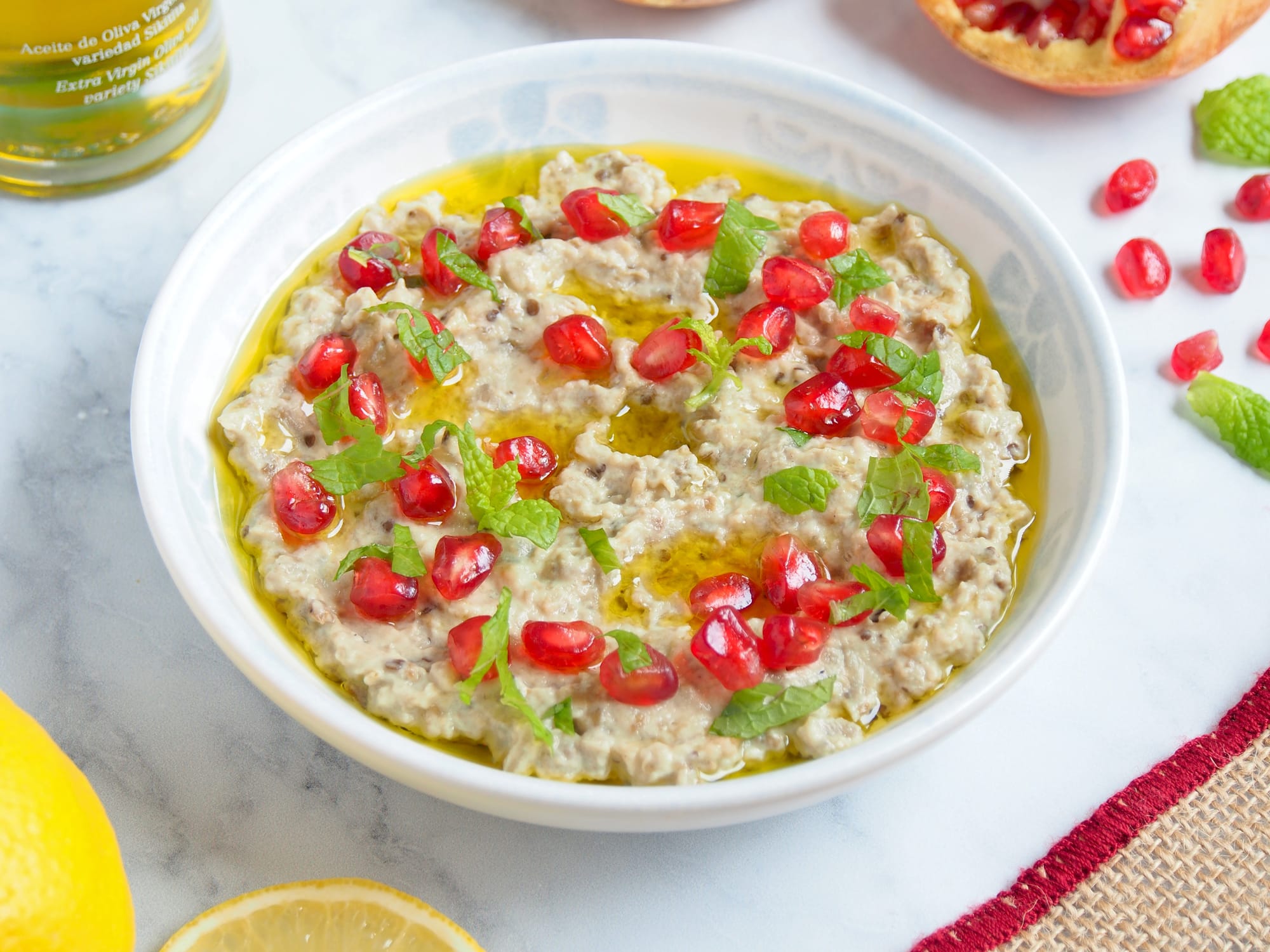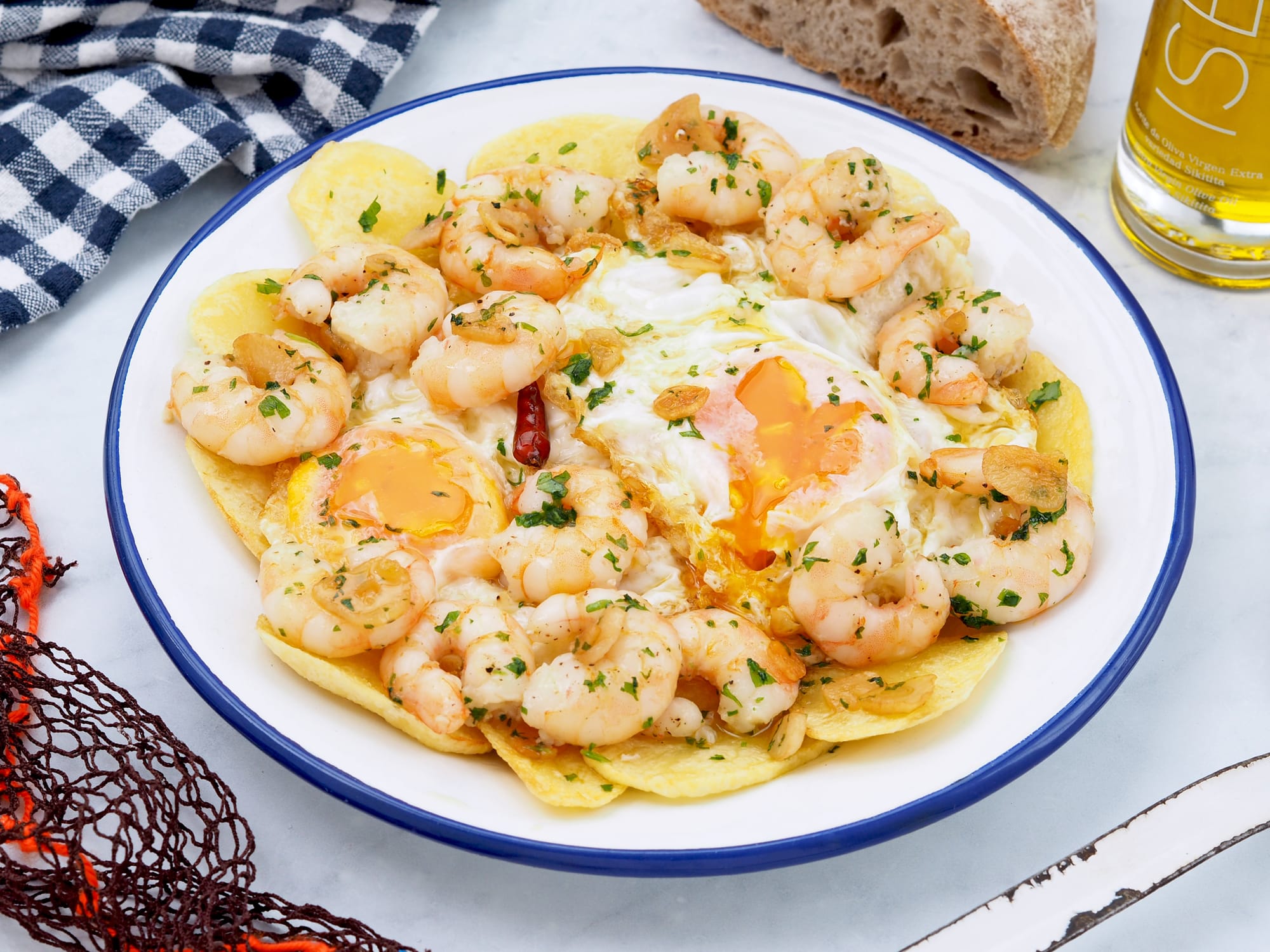 - Cena: para la cena voy a proponer uno de mis platos favoritos que son unos huevos rotos con gambas al ajillo que están de rechupete, un original tartar de fuet y un delicioso mutabal para dipear.