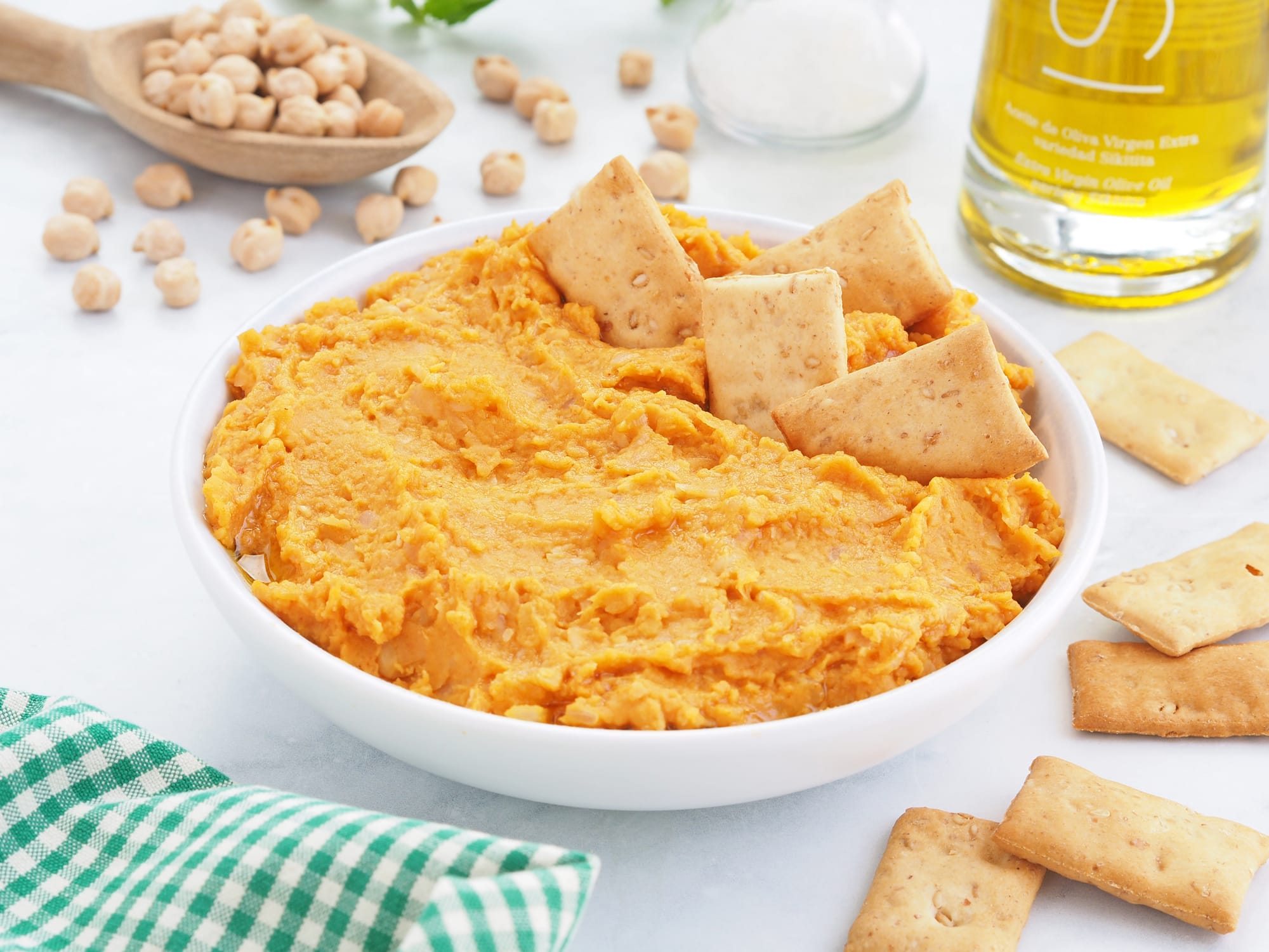- Cena: Como plato de cuchara podemos preparar una sopa de verduras y las otras dos propuestas son una muhammara para dipear, que es una especie de paté de pimientos asados con nueces, y unos sencillos y rápidos wraps de jamón y queso.