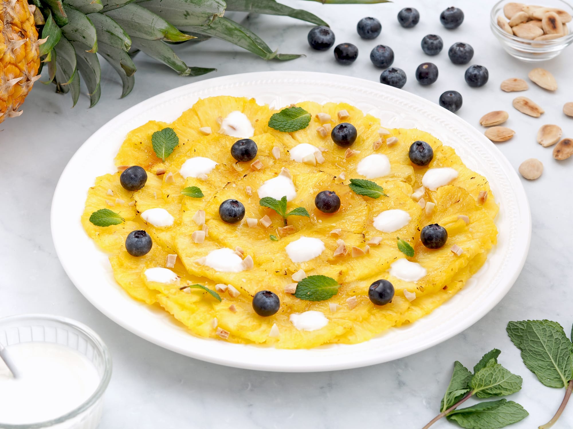 - Comida: Para el entrante propongo un morrococo de Jaén, conocido también como el hummus español, unas brochetas de salmón y verduras a la plancha como plato principal y un carpaccio de piña para el postre que podemos preparar con piña natural o en conserva.