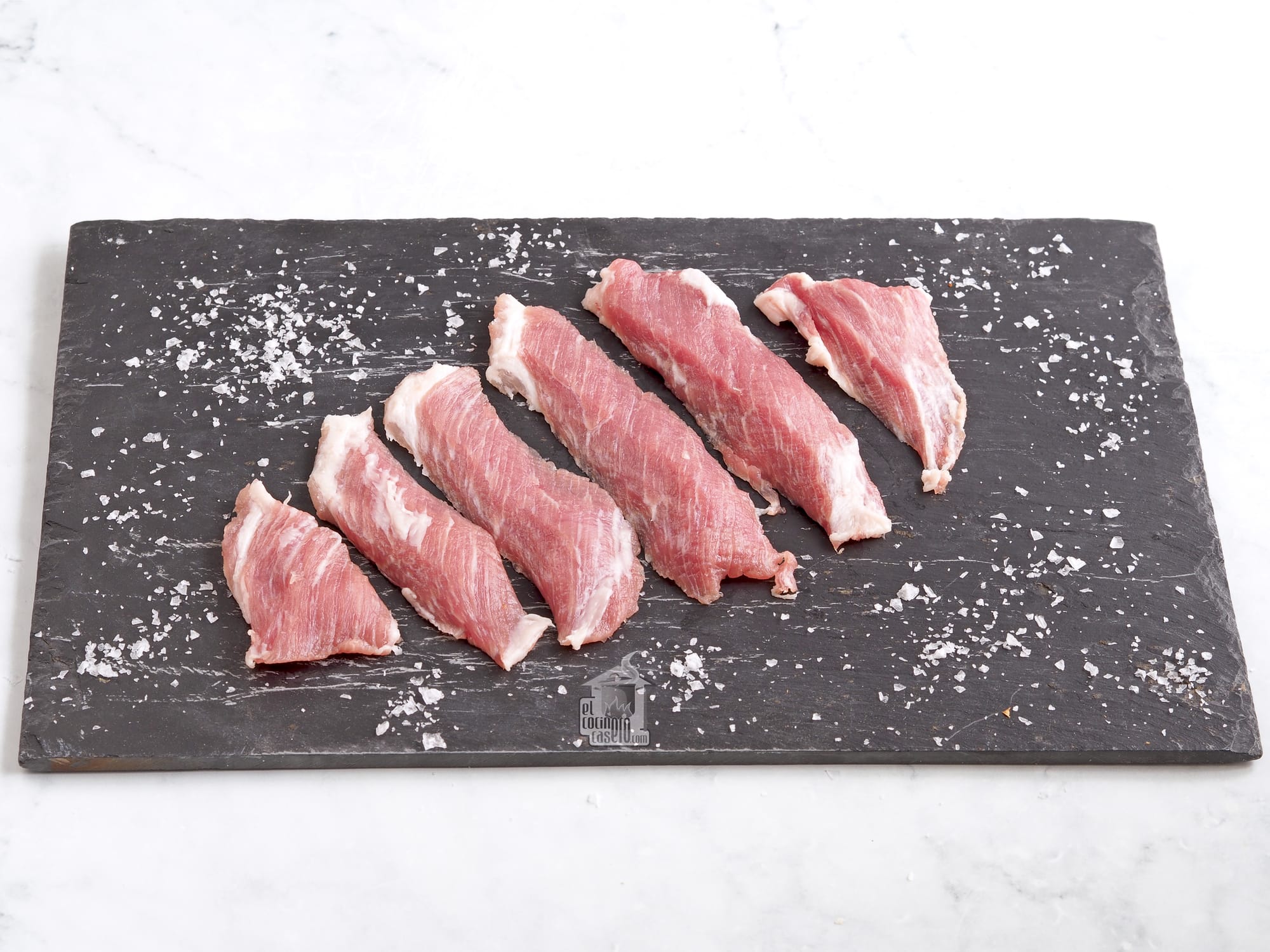 Antes de cocinar la carne en la piedra, la sacaremos de la nevera con la suficiente antelación para que esté a temperatura ambiente y la cortaremos en porciones finas y más bien pequeñas para que sean fáciles de manipular y se cocinen perfectamente en la piedra de asar.