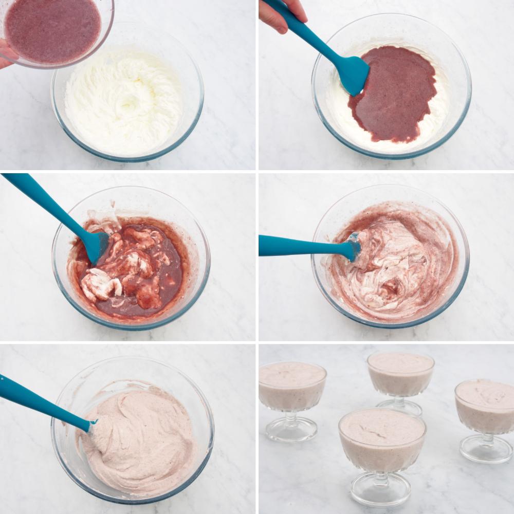 Cuando tengamos una mezcla perfectamente homogénea y el puré de arándanos bien integrado, ponemos la mousse en copas o vasitos individuales y la dejamos enfriar en la nevera un mínimo de 4 horas, aunque lo ideal sería dejarla de un día para otro.