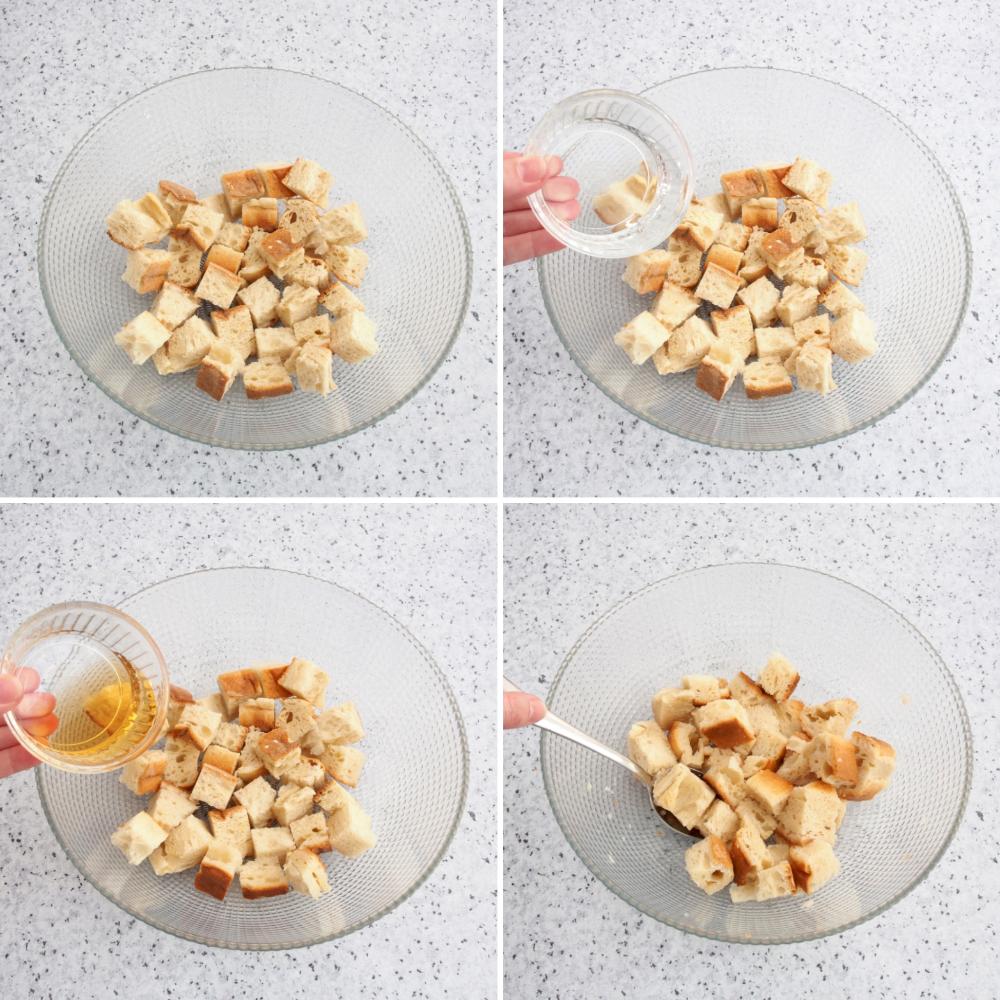 El pan que se usa para hacer la panzanella debe ser un pan compacto y con bastante miga y preferiblemente, que esté duro de un par de días, ya que los vamos a poner a remojo con agua y vinagre. Vamos a cortar el pan duro en dados más bien grandes como los que se ven en la foto.