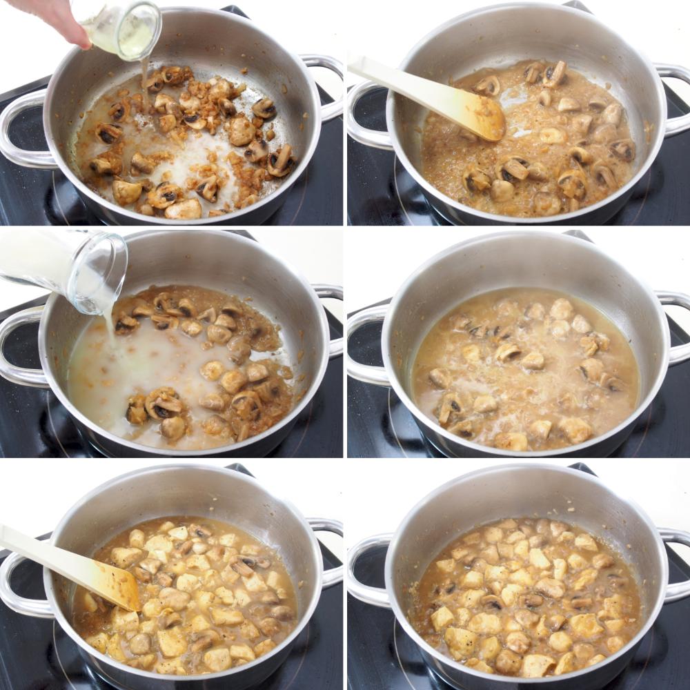 A continuación, subimos el fuego, añadimos el vino blanco y mezclamos bien. Dejamos cocinar 1-2 minutos para que se evapore el alcohol del vino. Después, añadimos el caldo de pollo, que lo tendremos bien caliente, mezclamos y esperamos a que el caldo empiece a hervir. En cuanto empiece el hervor, dejamos cocinar 3-4 minutos a fuego medio y a continuación, incorporamos el pavo a la cazuela, lo mezclamos bien en la salsa y dejamos cocinar el conjunto unos últimos 3-4 minutos a fuego medio.