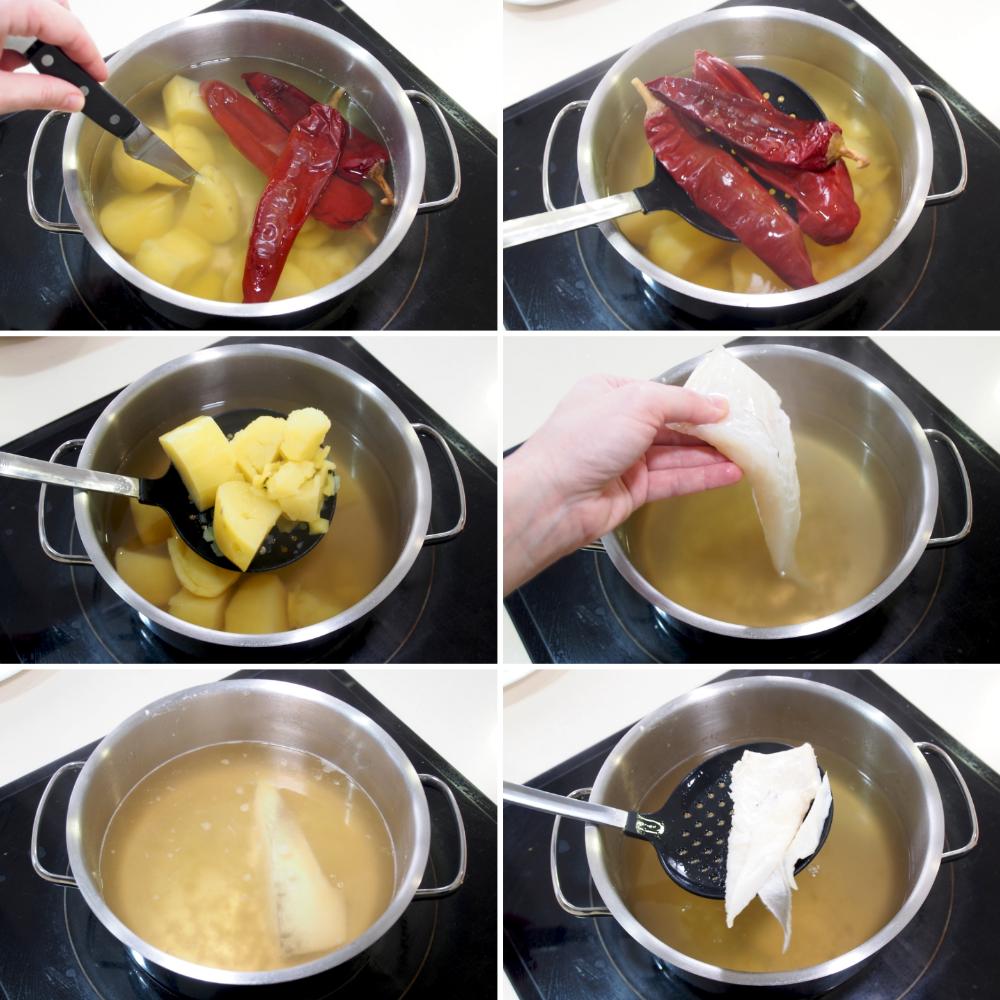 Pasados los 15 minutos, podemos pinchar una patata para comprobar que están bien cocidas y ya podemos retirar de la cazuela los pimientos choriceros y las patatas para dejarlos enfriar. En el mismo agua donde cocimos las patatas y los pimientos, vamos a cocer también el bacalao. Metemos el bacalao en la cazuela y lo dejamos cocer a fuego medio durante 2 minutos (dependiendo un poco del grosor del bacalao) o hasta que se empiece a separar en lascas. Después, lo sacamos de la cazuela y lo dejamos enfriar.